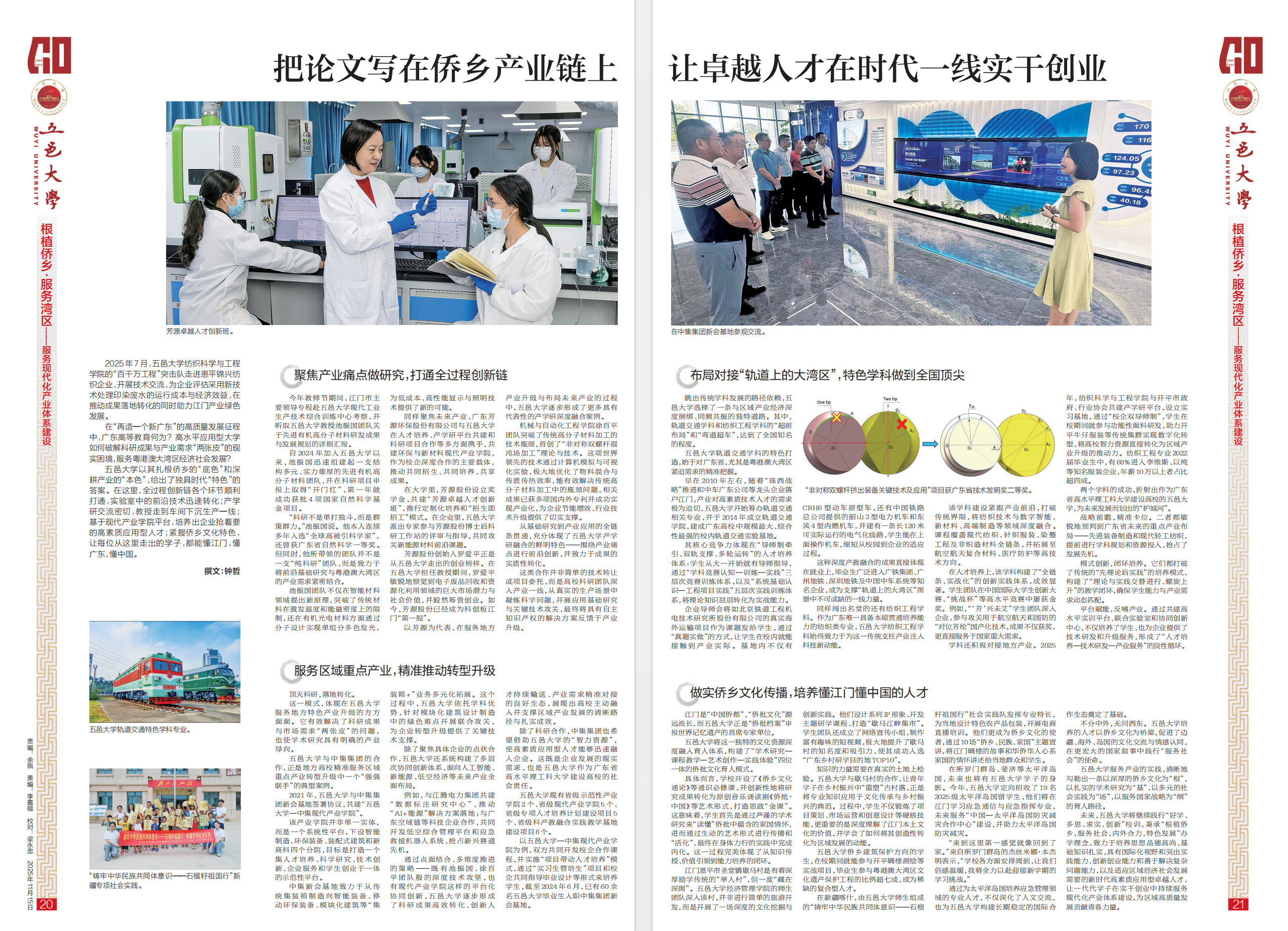 11月15日,在五邑大学迎来建校40周年之际,南方日报推出32个版特刊《侨心筑梦四十载 改革潮头再扬帆》,以“开篇”“四秩芳华·侨潮润邑”“砥砺奋进·硕果盈枝”“根植侨乡·服务社会”“四海交响·共筑未来”五大章节,回首传薪之路,为四秩邑大送上祝福。