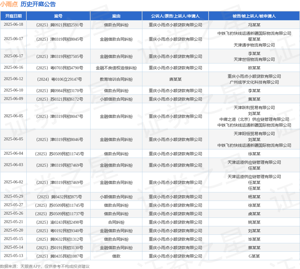 案号:(2025)苏0191民初3130号审理法院:江宁经济技术开发区人民法院案由:金融借款合同纠纷当事人信息: 原告/上诉人:重庆小雨点小额贷款有限公司 被告/被上诉人:蔡某某开庭日期:2025年5月14日根据统计,近一年内以重庆小雨点小额贷款有限公司为当事人的历史开庭公告有207则,其中案由为“小额借款合同纠纷”的公告以114则居首,其次为“金融借款合同纠纷”有48则,“债权转让合同纠纷”有17则。历史开庭公告(前20条)如下: